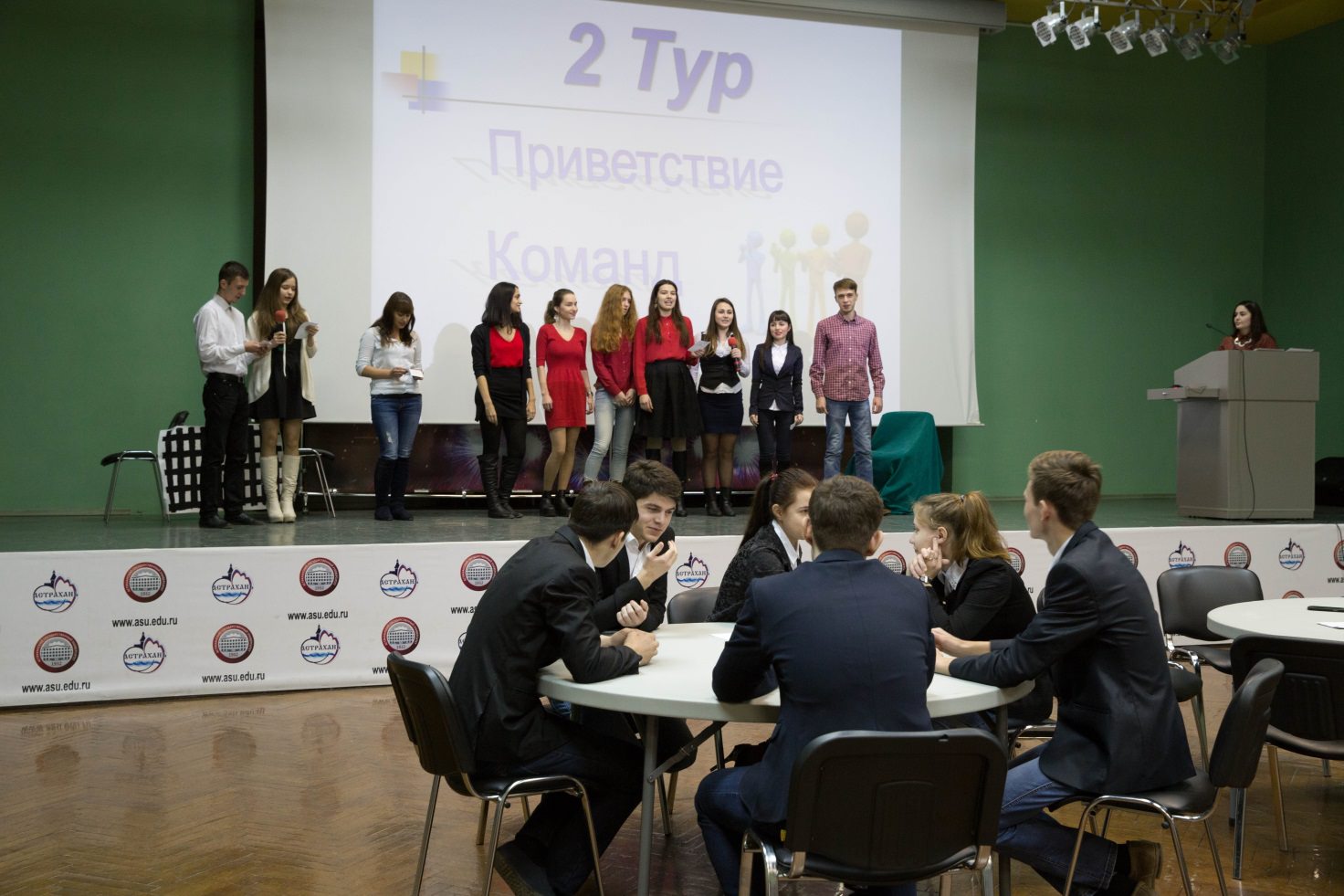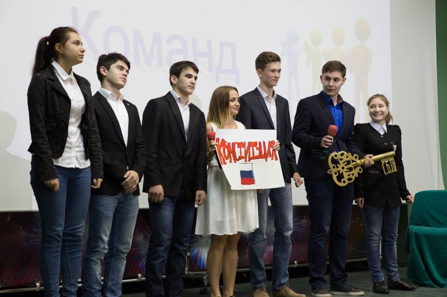 The welcoming stage implied the participants’ presentation of their short theatricalized performances to emphasize the importance of the Constitution. A quiz that required giving the right response within a limited time has been the most interesting stage. The supporting groups could also help their teams’ success by demonstrating their excellent knowledge of Law in the contest for supporters. As for the last stage (the Rush for Leader), the participants were to guess the identity of a politician displayed on the screen.