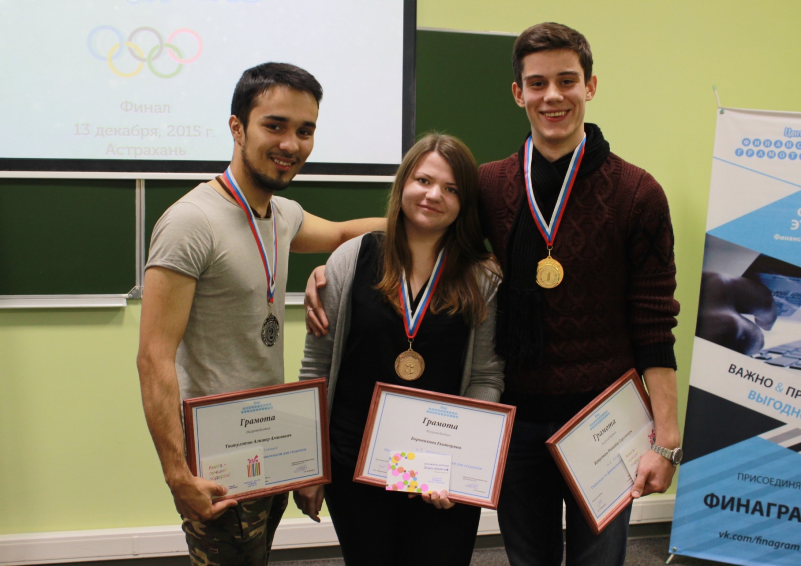 The Final of the Winter Contest in Financial Literacy has passed on December 13, 2015 at Astrakhan State University. The seven participants have taken part in a table game in Economics, whose results have determined the winners: the 1st place – Nikita Kapustin (the Astrakhan State Institute of Engineering and Construction), the 2nd place – Alisher Toshpulotov (Astrakhan State University, the Department of World Economy & Management), the 3rd place – Ekaterina Boronikhina (Astrakhan State University, the Department of World Economy & Management). They got “Olympic” medals, diplomas of honor, and valuable presents.