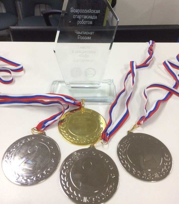 72 teams contested in various nominations. The team of ASU that included Mikhail Ilmenskiy and Ivan Kolesnikov presented four robots: the PucksHarvester-1 and the PucksHarvester-2 (for the category “Robo Sorting”), the Killdozer (for the category “Mega Sumo”), and the Neuro-bulldozer (for the category “Neuro Sumo”). As a result, our students got a golden (the PucksHarvester 2) and three silver (the PucksHarvester 1, the Killdozer, and the Neuro-bulldozer) medals.