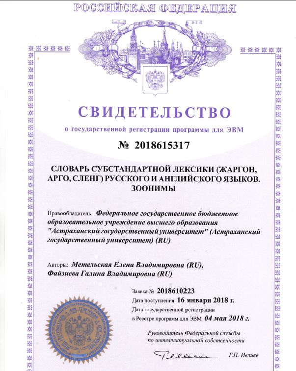 The Russian Federal Service for Intellectual Property (Rospatent) has issued a patent for their development “Dictionary of Russian & English Substandard Vocabulary (Jargon, Argot, Slang). Zoonyms”.