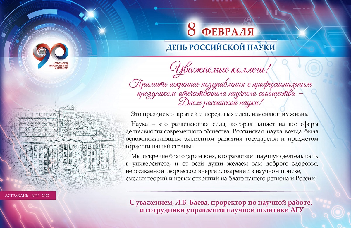 Дорогие коллеги, уважаемые учёные Астраханского государственного университета! От всей души поздравляю вас с профессиональным праздником всего университетского сообщества!