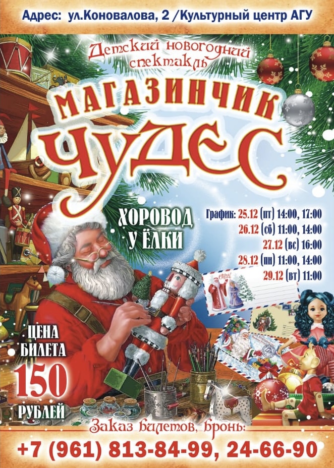 Дети сотрудников АГУ смогут бесплатно посетить новогодние представления 27 декабря в 10:00 и в 13:00.
