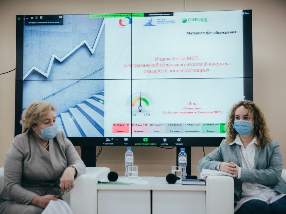 О том, как выглядит индекс роста МСП в России в целом и в Астраханской области в частности по итогам третьего квартала 2020 года, подробно рассказала руководитель экспертного центра при уполномоченном при президенте РФ по защите прав предпринимателей, директор Института экономики роста имени П. А. Столыпина Анастасия Алехнович. В формате видео-конференц-связи она представила подробные статистические данные по отраслям и видам деятельности и по субъектам Федерации. В результате произведённых расчётов получилось, что индекс роста МСП в регионе снизился относительно второго квартала на 1,6 пункта, и это свидетельствует о нахождении Астраханской области в зоне стагнации.