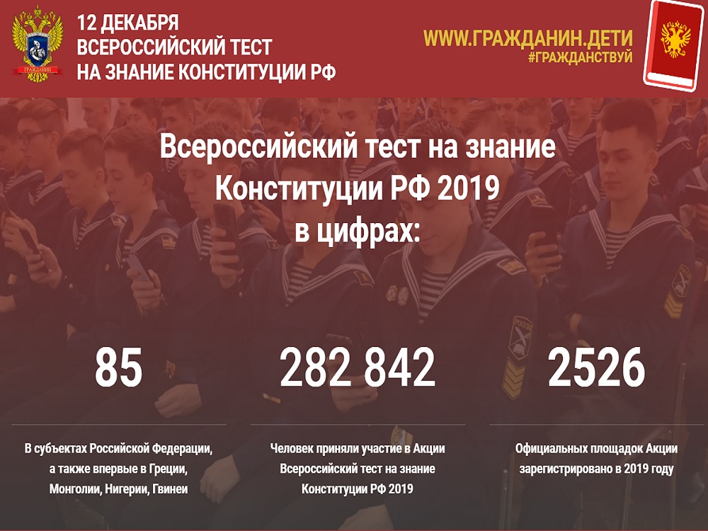 Отметим, число участников и география теста растёт с каждым годом. В 2016 году в акции принимало участие всего несколько учебных заведений, а в 2019 году тестирование прошло свыше 280 000 человек по всей России, в нём приняли участие русскоговорящие общины в Греции, Монголии, Гвинее, Нигерии. Вырос и уровень знаний относительно конституционных прав и обязанностей граждан: за четыре года средний балл поднялся с 6 до 11 из 20 возможных.