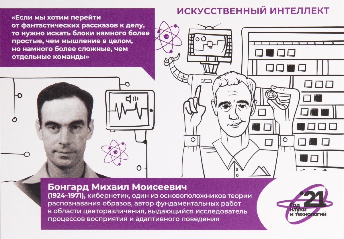 Каждая открытка соответствует одному из тематических месяцев Года науки и технологий. На ней изображены портрет учёного, внёсшего значительный вклад в развитие науки в данном направлении, цитата и иллюстрация его деятельности. Оригинальная концепция и дизайн принадлежат АНО «Национальные приоритеты».
