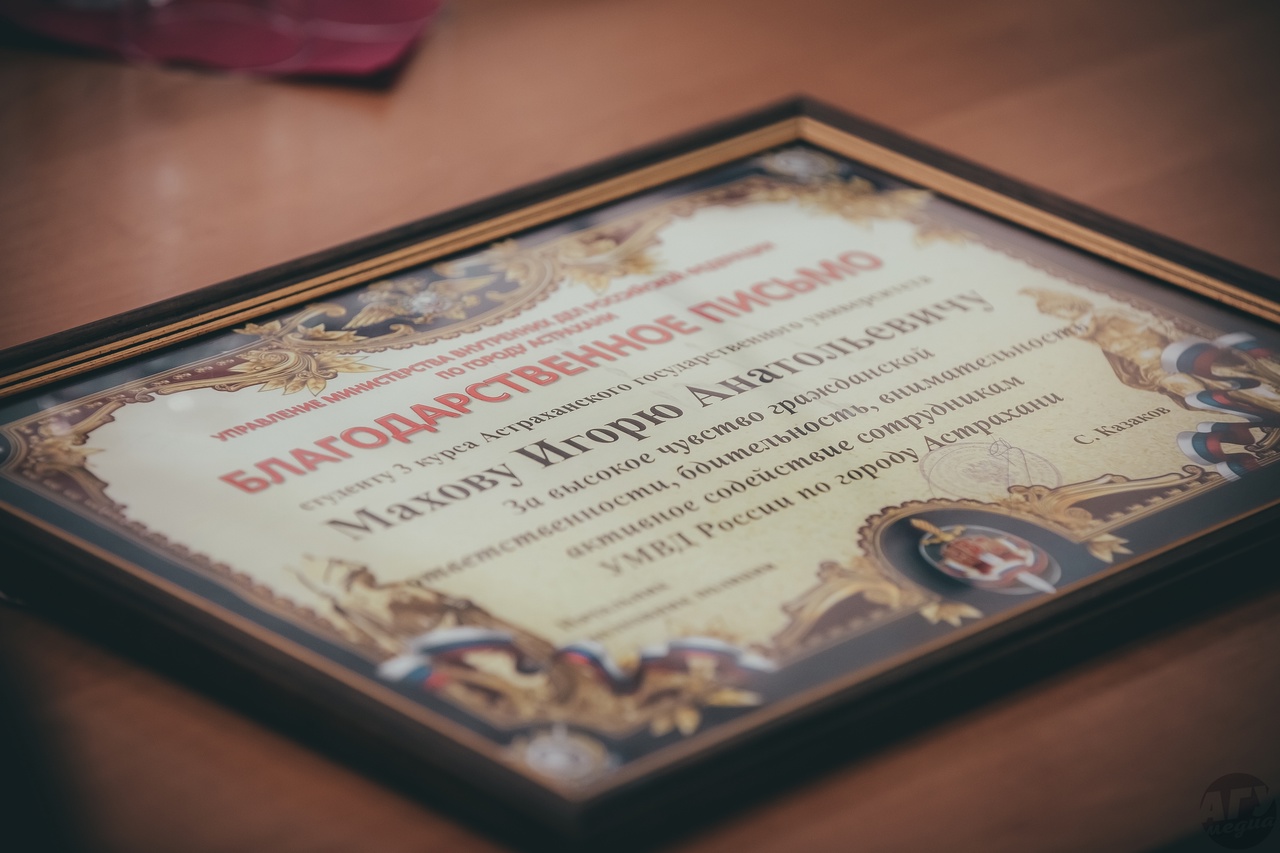 Представитель Управления Министерства внутренних дел и ректор АГУ вручили Игорю Махову благодарственное письмо за высокое чувство гражданской ответственности, бдительность, внимательность, активное содействие сотрудникам УМВД России по г. Астрахани.