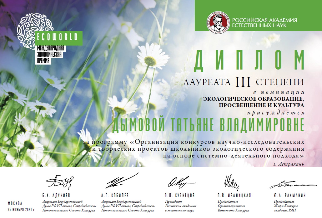 По решению президиума РАЕН Татьяна Дымова была удостоена диплома за третье место и медали лауреата премии за разработку «Организация конкурсов научно-исследовательских и творческих проектов школьников экологического содержания на основе системно-деятельностного подхода и повышение профессиональной компетентности педагогов в руководстве проектами» в номинации «Экологическое образование, просвещение и культура».