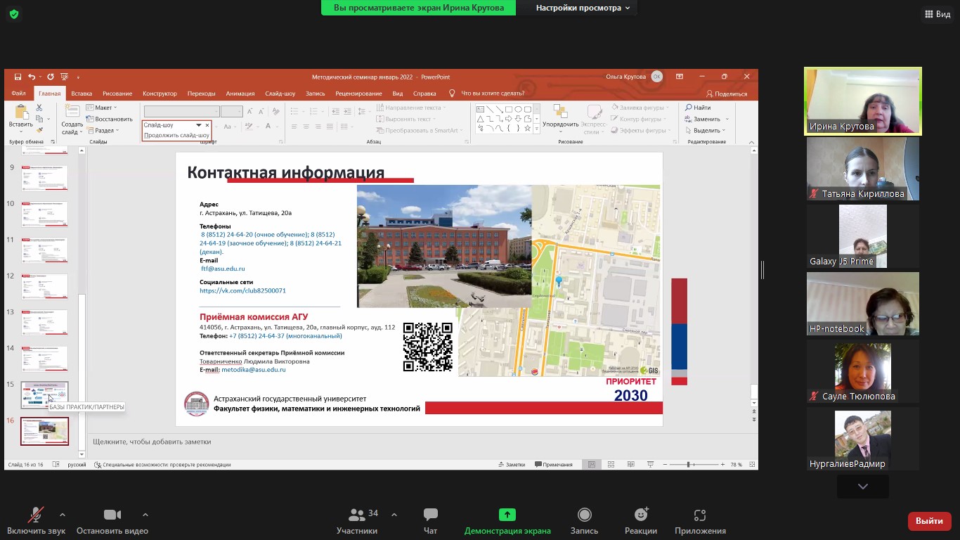 Открывая мероприятие, завкафедрой теоретической физики и методики преподавания физики АГУ Ирина Крутова рассказала о планах работы семинара, о правилах приёма в вуз в 2022 году, о направлениях подготовки, реализуемых на факультете, и о количестве бюджетных мест. Кроме того, от неё присутствующие узнали о способах и сроках подачи документов, об экзаменах «по выбору» и о преимуществах выбора более трёх предметов для сдачи ЕГЭ. Также учителей пригласили на предстоящую 21–22 апреля Международную конференцию «Конвергенция современных образовательных политик для решения проблем Прикаспийского региона».