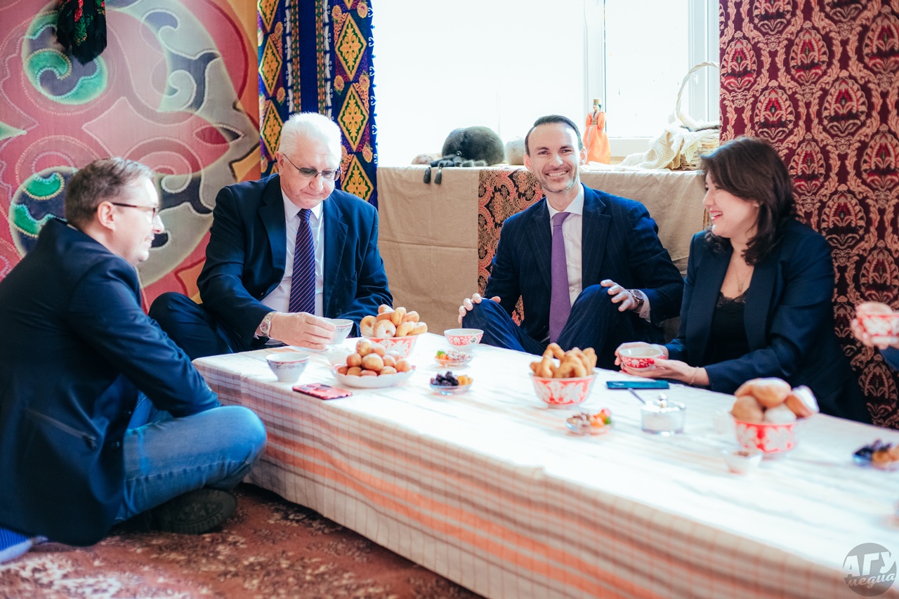 В день экскурсии делегацию МГУПП встретили по традициям калмыцкого гостеприимства: студентки в национальных костюмах усадили гостей на подушки и угостили настоящим калмыцким чаем и боорцоками.