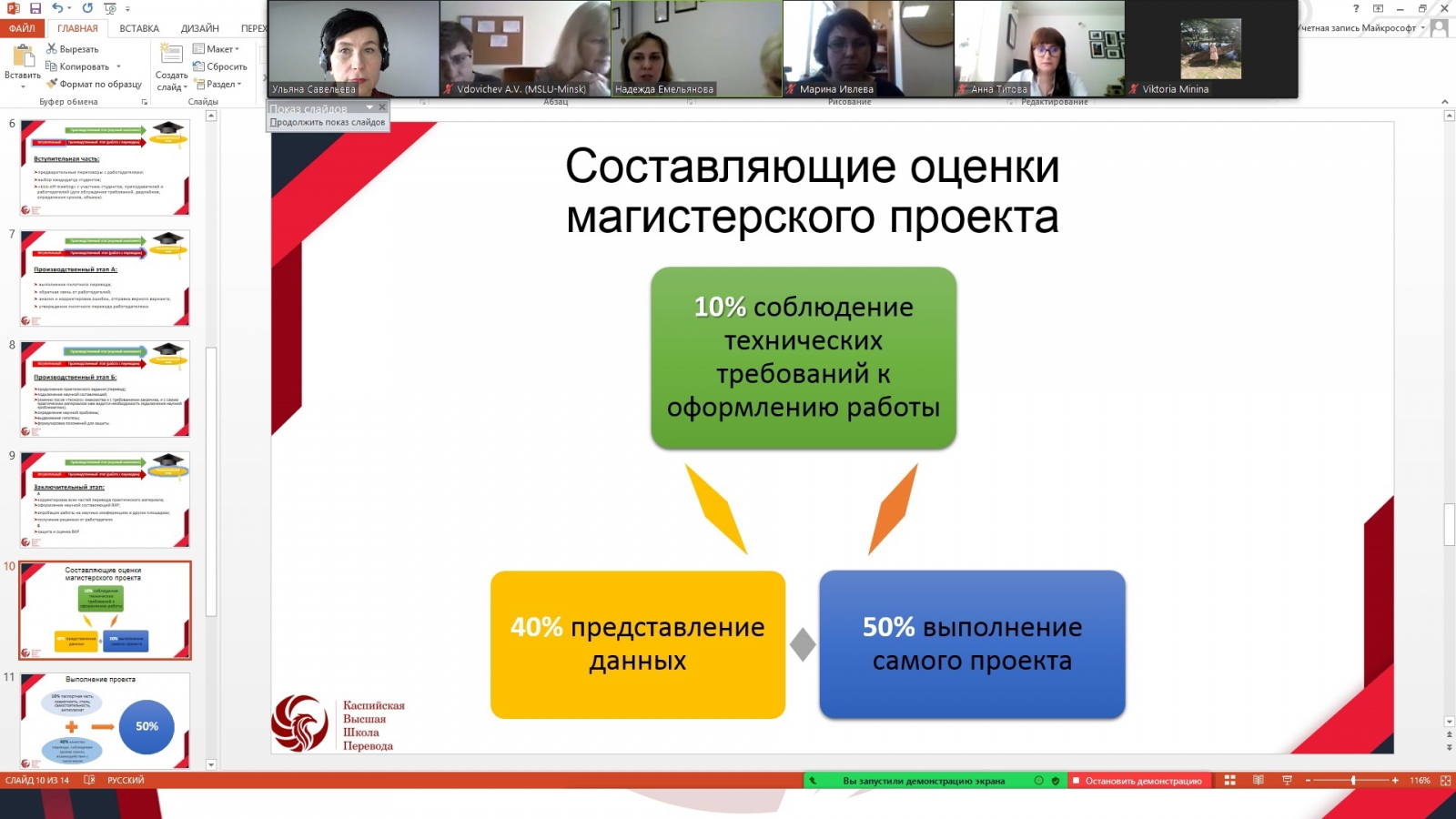 На практической платформе форума специалисты КВШП провели мастер-класс «Спичрайтинг как инструмент обучения устному переводу». Преподаватели Каспийской высшей школа перевода показали студентам российских и белорусских вузов, каким образом можно использовать упражнение по составлению речей для улучшения своего устного перевода, объяснили, какие ключевые моменты нужно учесть при написании учебной речи под перевод, а также провели небольшой интерактив по спичрайтингу.