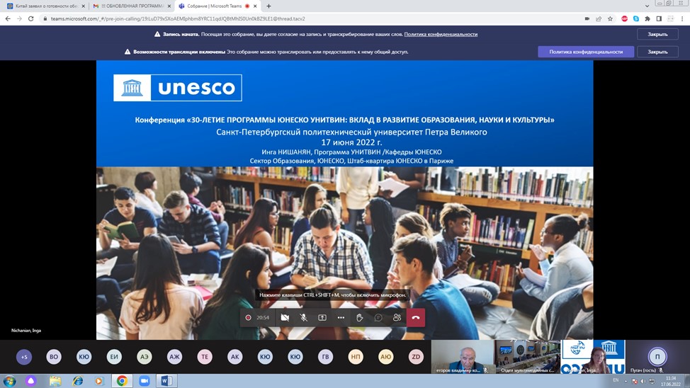 Координатор программы УНИТВИН/Кафедры ЮНЕСКО Инга Нишанян обратилась к участникам конференции по видеосвязи из штаб-квартиры ЮНЕСКО в Париже. Эксперт напомнила историю создания программы, рассказала о новых возможностях её развития.