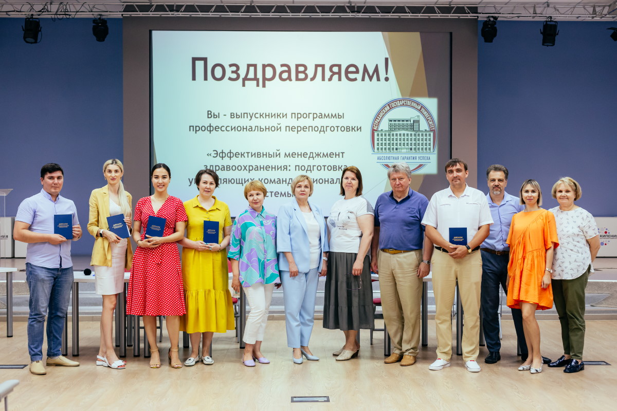 Каждый из слушателей получил диплом о профессиональной переподготовке с присвоением квалификации «менеджер в сфере здравоохранения» из рук первого заместителя министра здравоохранения Астраханской области Светланы Смирновой и первого проректора — проректора по стратегическому развитию АГУ Элины Полянской.
