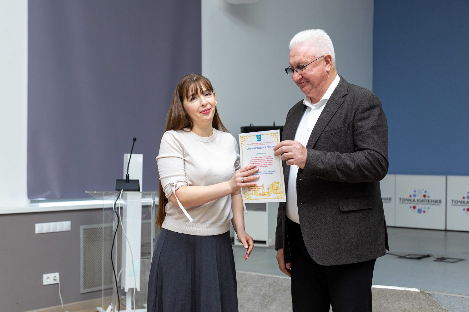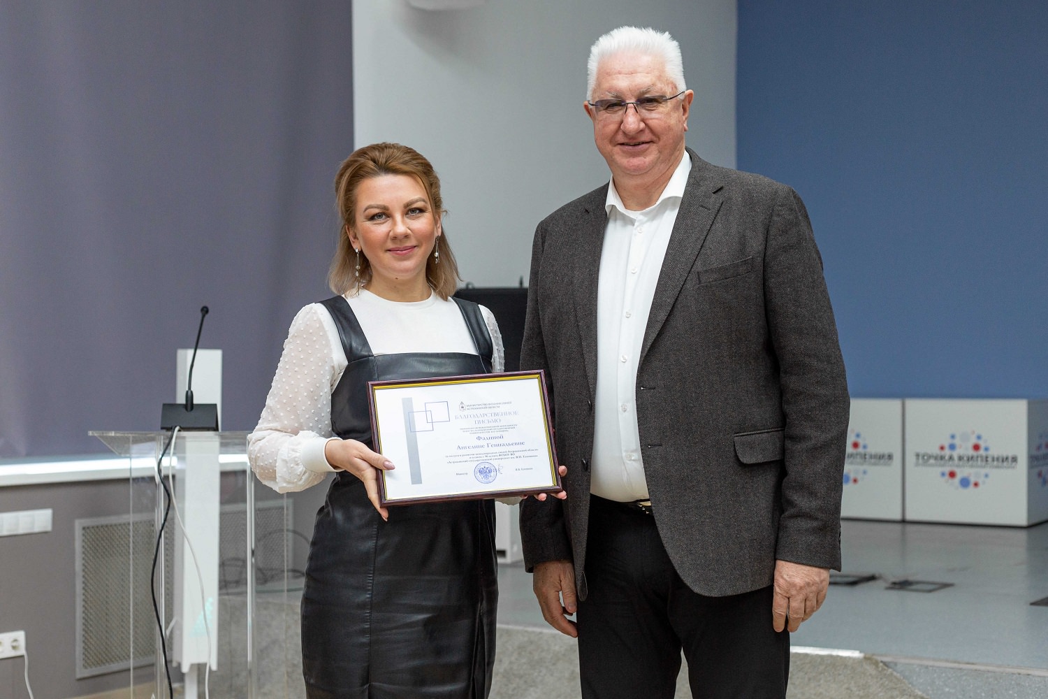 Министерство внешних связей Астраханской области за заслуги в развитии международных связей АО и в связи с 90-летием университета отметило благодарственным письмом Ангелину Фадину.