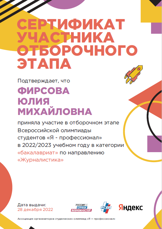 В результате отборочного этапа будущие журналисты продемонстрировали свои профессиональные компетенции, широту кругозора и глубину знаний. 14 участников были выбраны для продолжения состязания во втором туре олимпиады, при условии, что проходной балл составил 50. При этом их работы в большинстве своём были оценены в 60 баллов и больше. Три материала удостоились высших отметок.