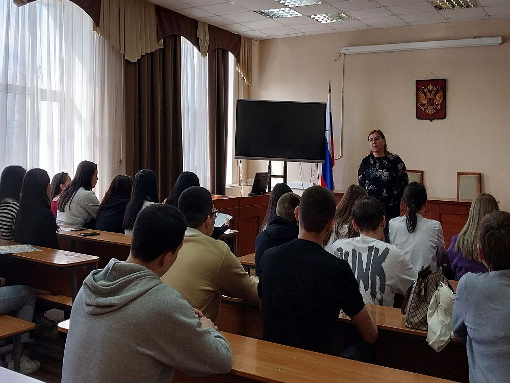В зале судебных заседаний старший преподаватель кафедры теории и истории государства и права АГУ Ольга Ивашкович познакомила учащихся с основными образовательными программами юридического факультета, преимуществами обучения на направлениях и возможностях трудоустройства.