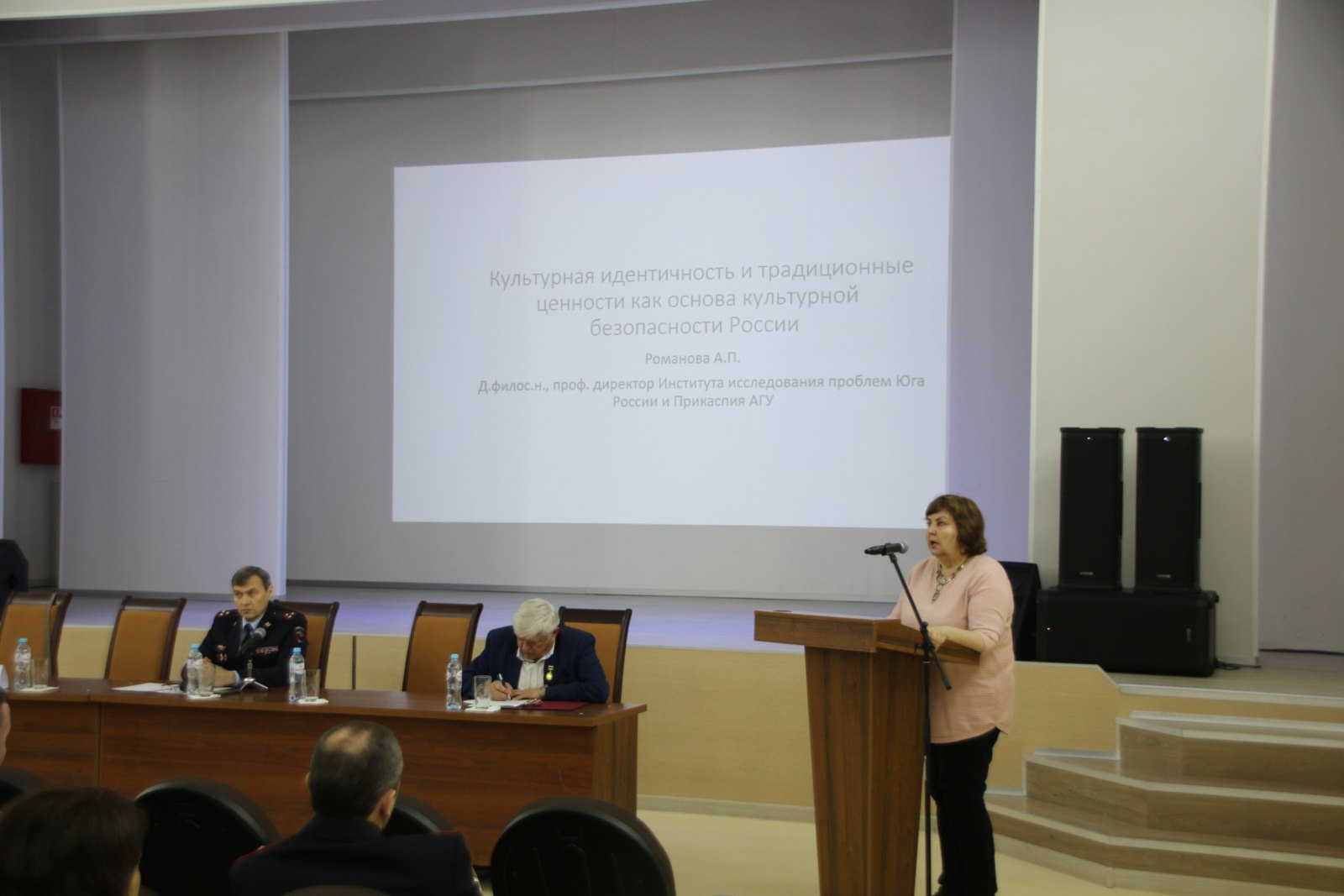 Доктор философских наук, профессор кафедры культурологии, главный научный сотрудник Института исследований проблем юга России и Прикаспия Анна Романова выступила с докладом на тему «Культурная идентичность и традиционные ценности как основа культурной безопасности России».
