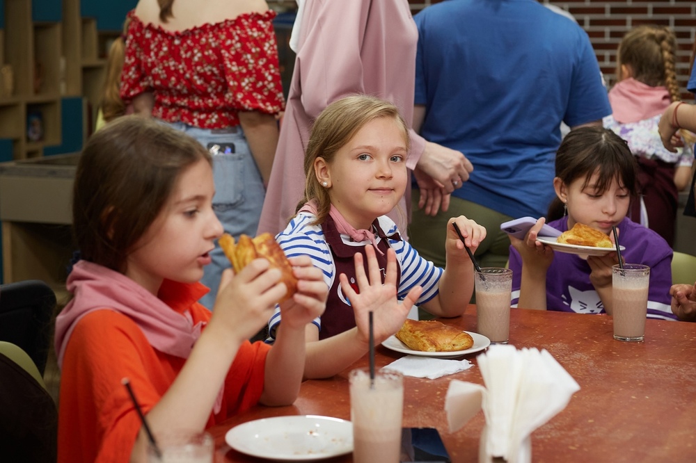 Школьниками было приготовлено шесть блюд: пицца, цветные блины, шоколадно-банановый коктейль, слойки с начинкой, бургеры и пельмени.