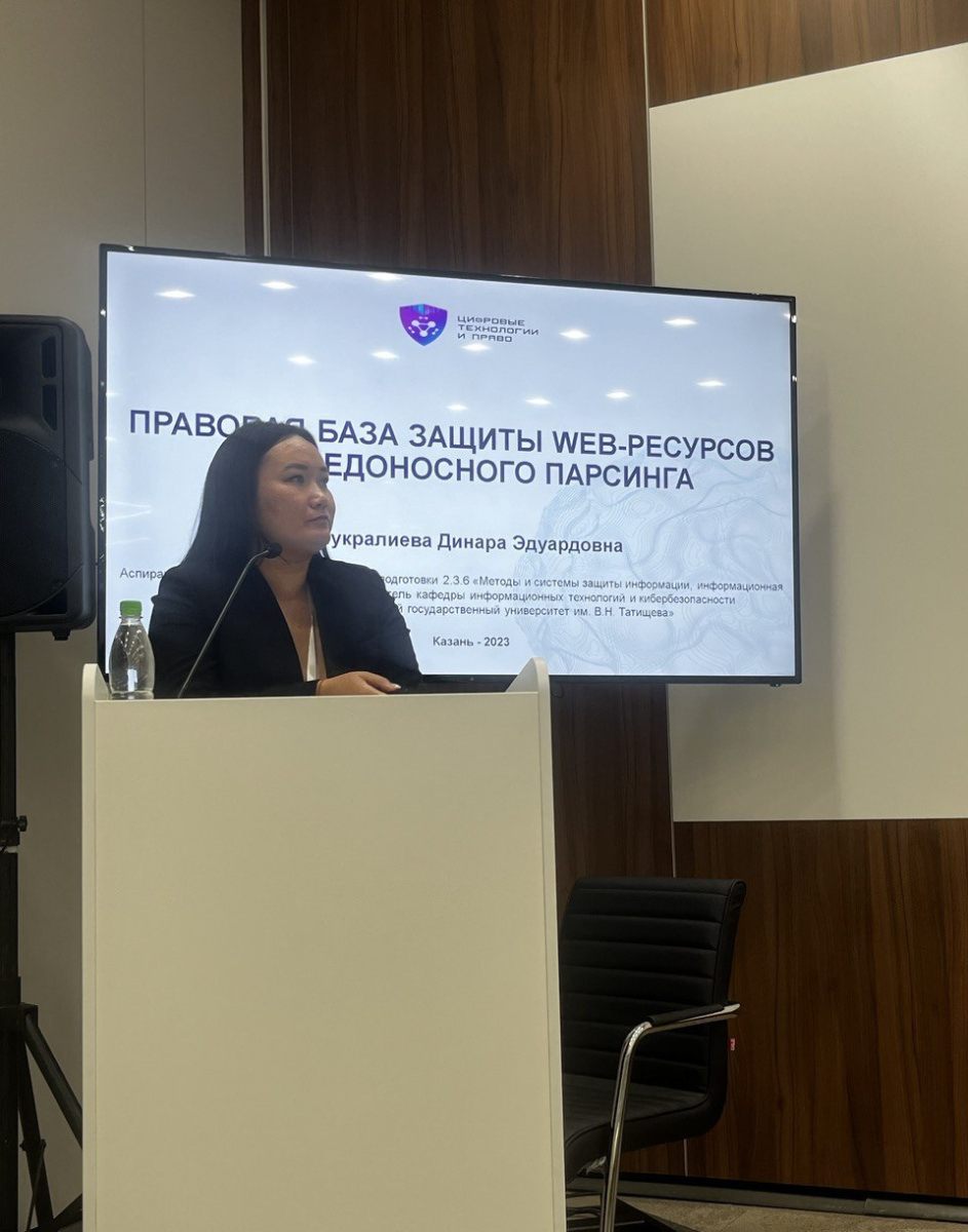 Девушка также приняла участие во II Международной научно-практической конференции «Цифровые технологии и право» в рамках международного форума, прошедшего в Казани. Целью выступления стала апробация научных результатов диссертационного исследования на тему «Правовая база защиты WEB-ресурсов от вредоносного парсинга».