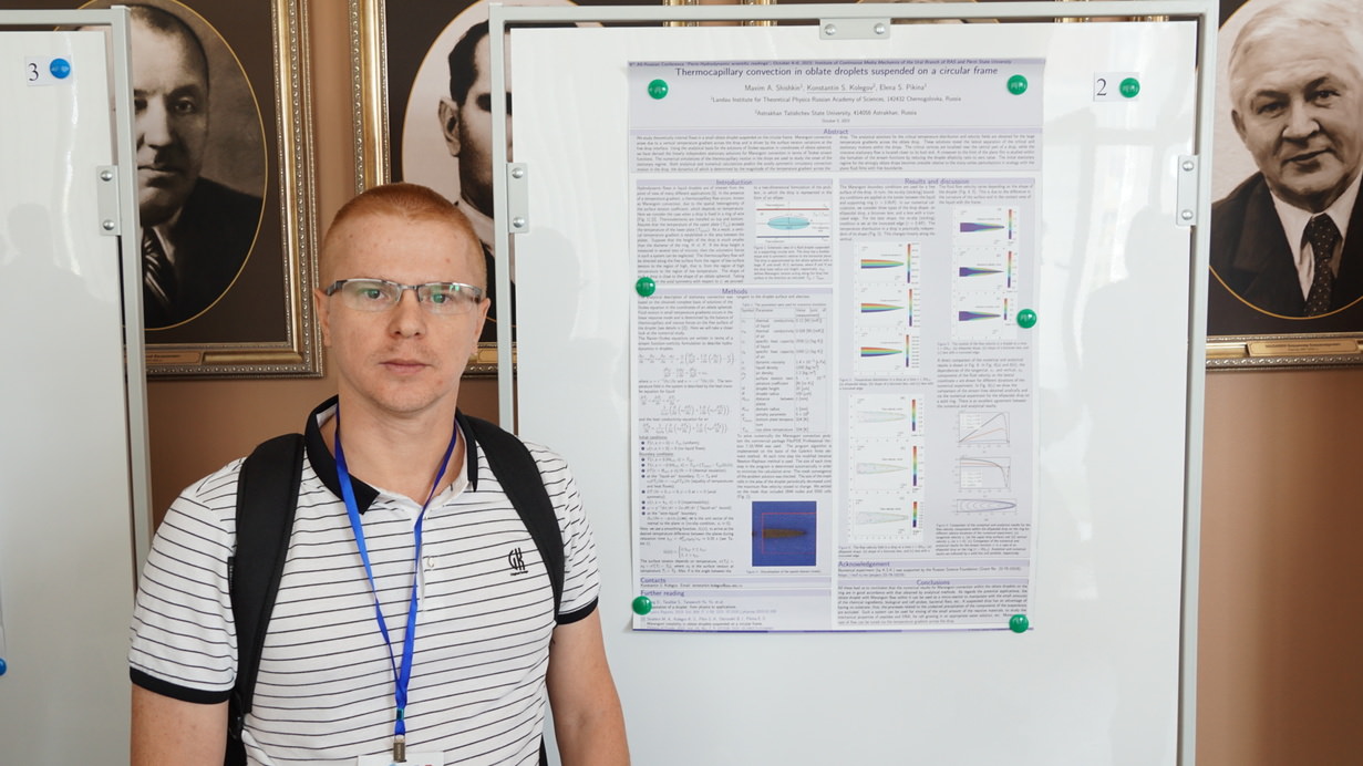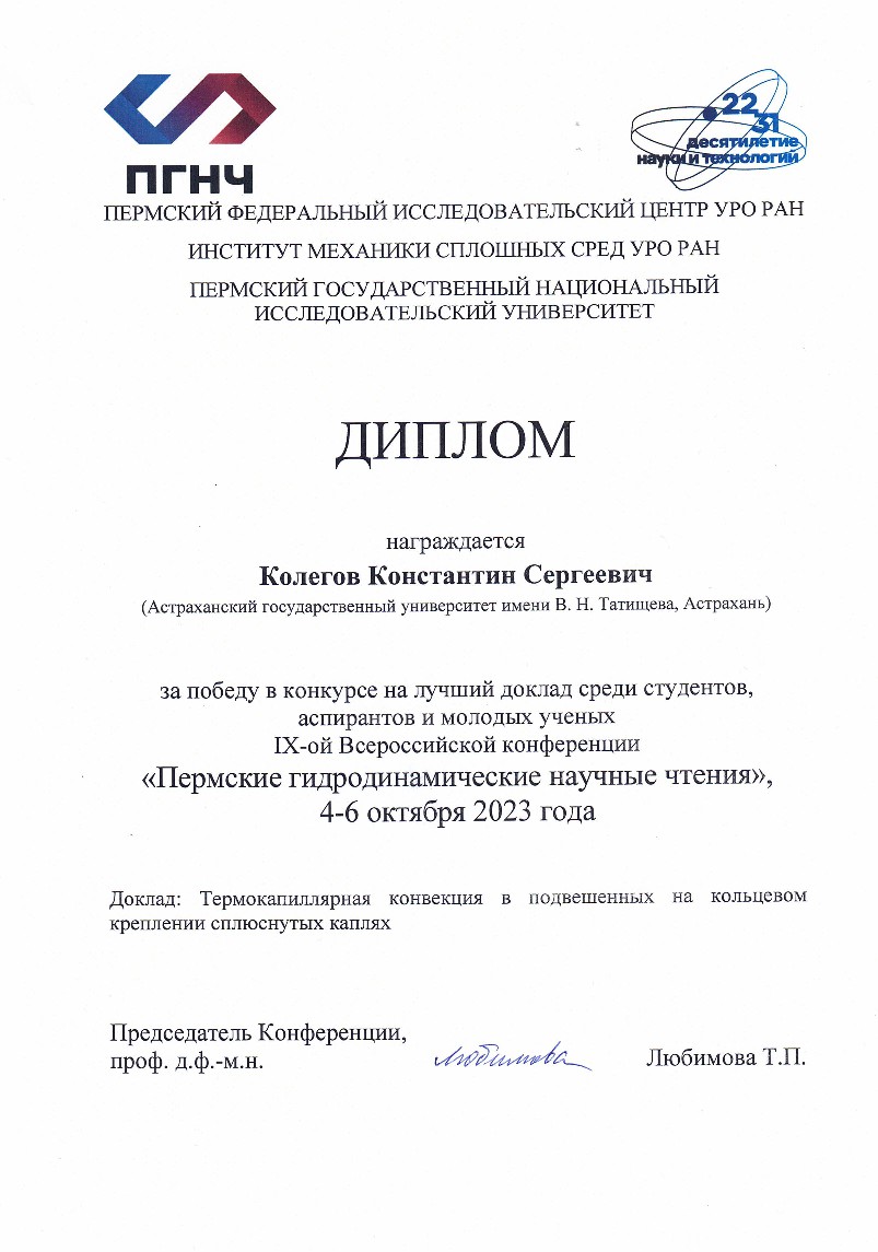 Сотрудник лаборатории «Математическое моделирование и информационные технологии в науке и образовании» Астраханского государственного университета имени В. Н. Татищева Константин Колегов представил тему «Термокапиллярная конвекция в подвешенных на кольцевом креплении сплюснутых каплях» и получил диплом за победу в конкурсе на лучший доклад среди студентов, аспирантов и молодых учёных.