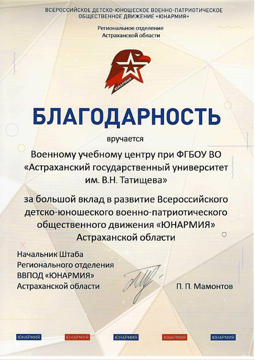 Он поблагодарил всех причастных за организацию совместной работы и тесное взаимодействие в вопросах воспитания юных защитников. Начальник штаба вручил ВУЦ АГУ благодарность за большой вклад в развитие Всероссийского детско-юношеского военно-патриотического общественного движения «Юнармия» Астраханского области.