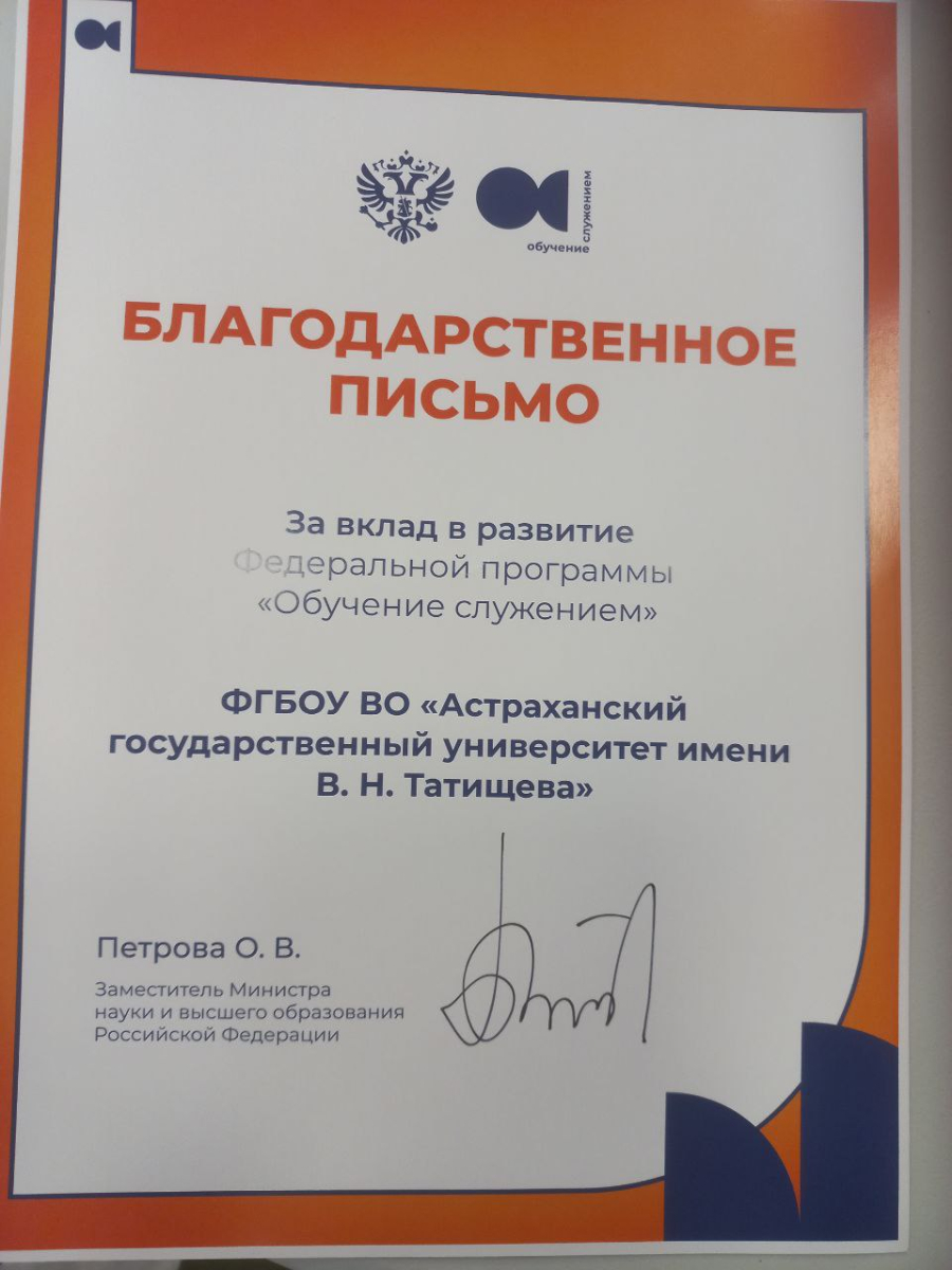 Среди российских вузов Астраханский госуниверситет выделяется успешным опытом реализации программы «Обучение служением». За вклад в её развитие АГУ получил благодарственное письмо от Министерства науки и высшего образования Российской Федерации.