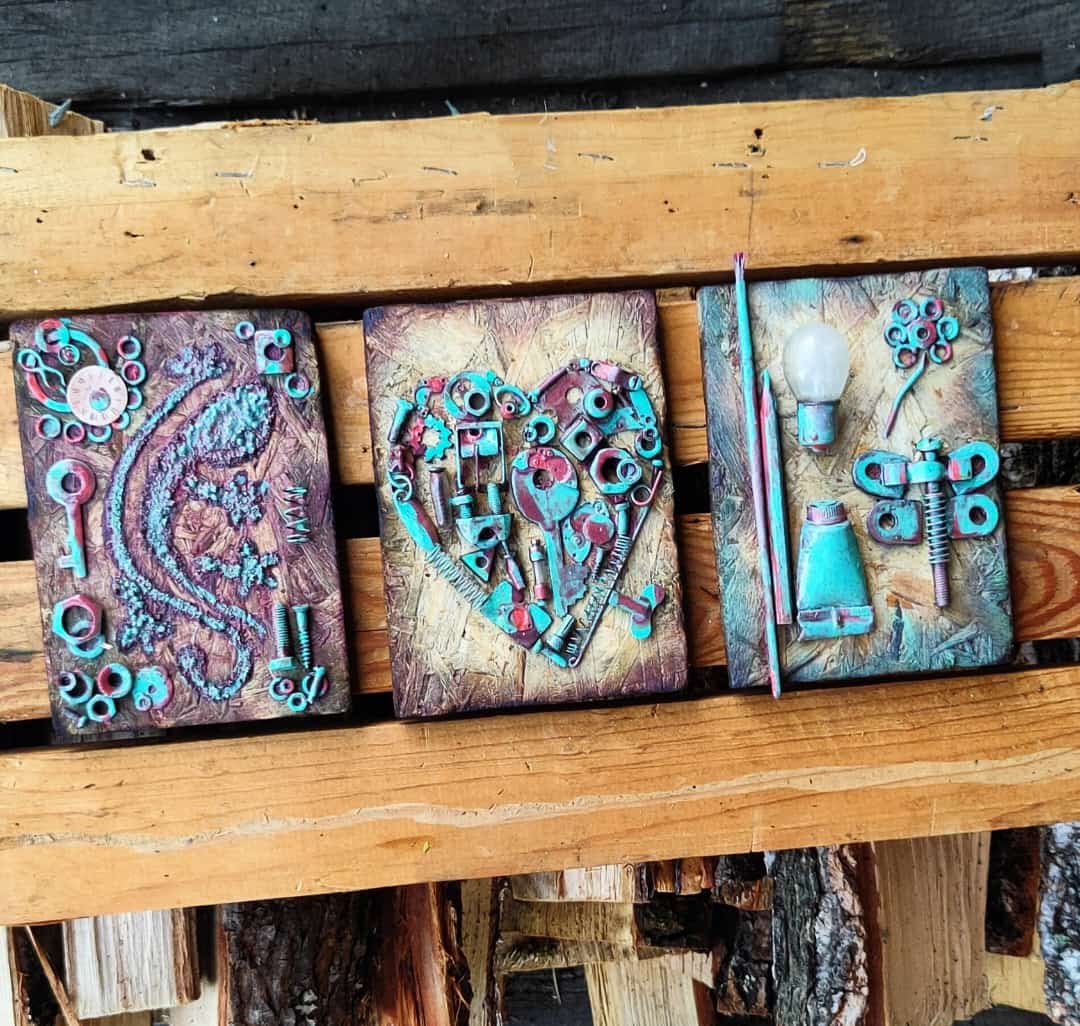 «Я делала открытки с картинками из журналов, приклеивала на них кофейные зёрнышки в качестве декора, покрывала разноцветным лаком для ногтей цветочки из макаронин. В коробку из-под конфет собирала бусинки, пёрышки, бумажные обрезки, камешки, гаечки, ленточки... Любимыми материалами стали клей ПВА и «Момент», — вспоминает мастерица.