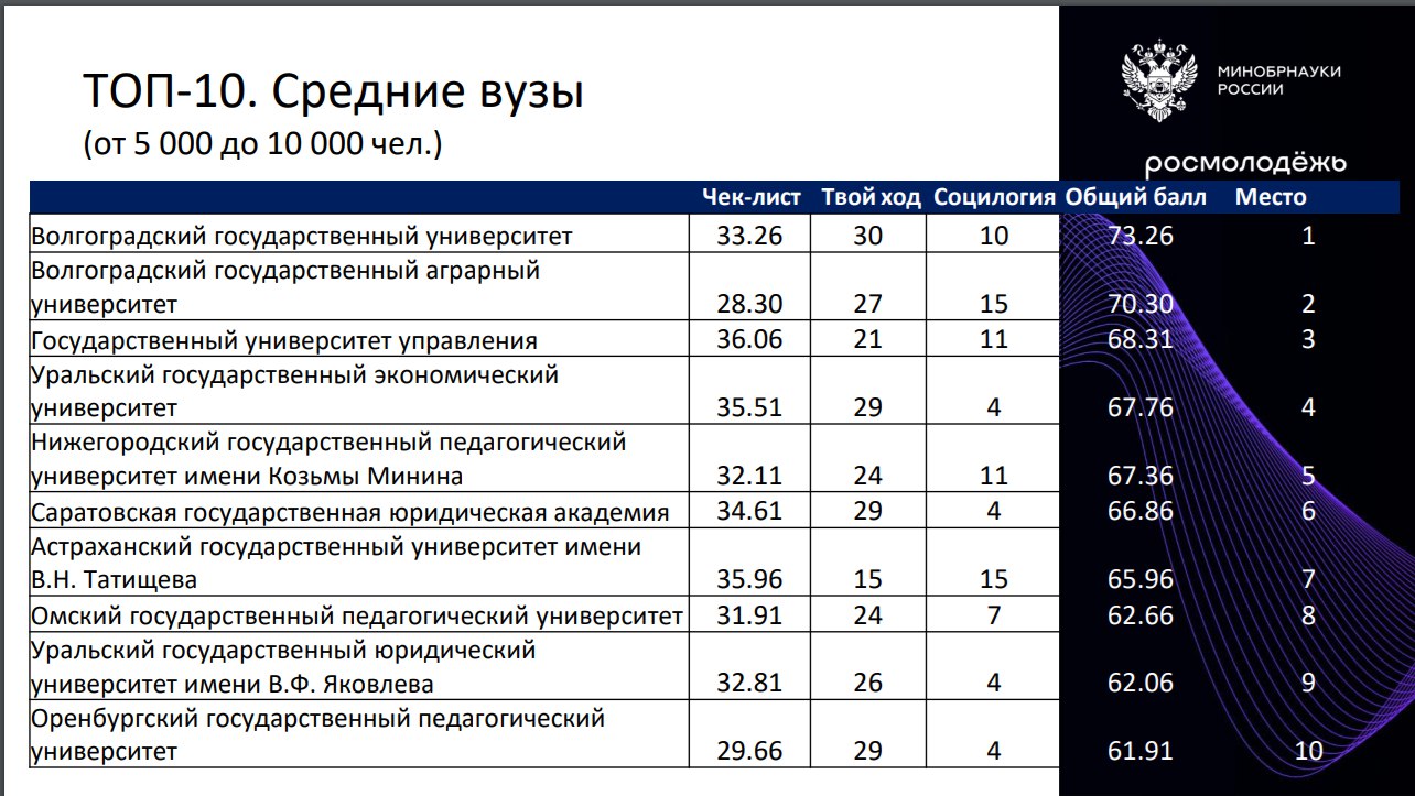 3) индекс эффективности «Твой ход», учитывающий активность вузов на платформах «Россия — страна возможностей», «Росмолодёжь.Гранты» и «Твой ход».