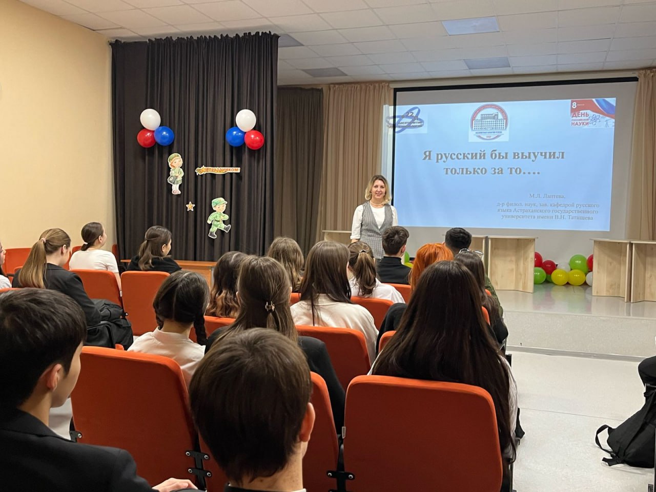 Заведующая кафедрой русского языка, профессор Мария Лаптева организовала лекцию «Я русский бы выучил только за то...». Старшеклассники узнали о роли языка в культуре народа, сильной позиции русского языка в мире и его высоком месте в индексе глобальной конкурентоспособности языков.