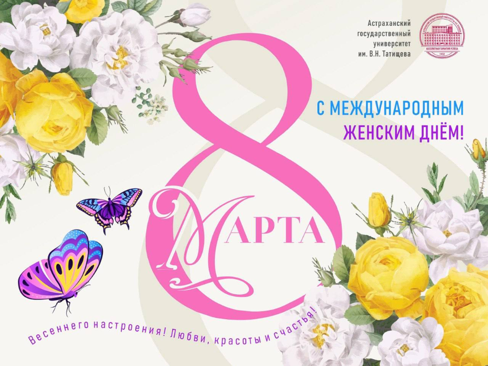 Уважаемые сотрудницы и студентки Астраханского государственного университета имени В. Н. Татищева! Сердечно поздравляю вас с Международным женским днём! Этот праздник олицетворяет начало весны, пробуждение природы и торжество красоты.