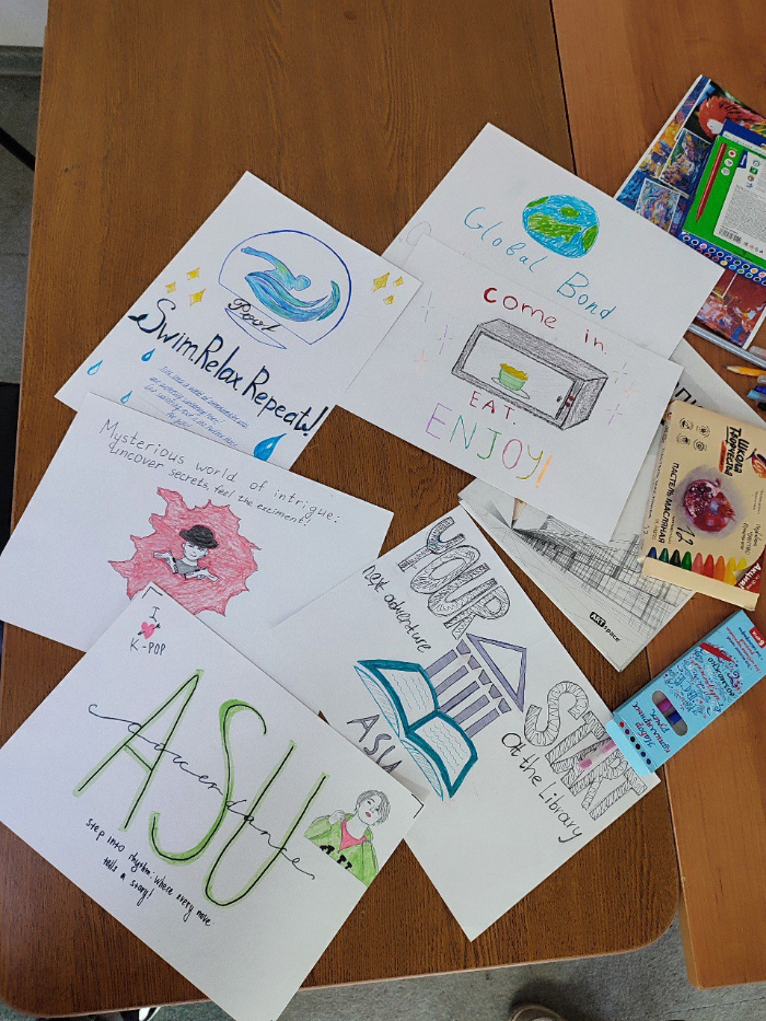 Творческие группы создали запоминающиеся логотипы, рекламные тексты и слоганы на английском языке для студенческих клубов, столовой, библиотеки и бассейна. Это позволило учащимся продемонстрировать свои языковые навыки и креативное мышление. В результате получились яркие и оригинальные проекты, которые могли бы стать частью реального университетского брендинга.