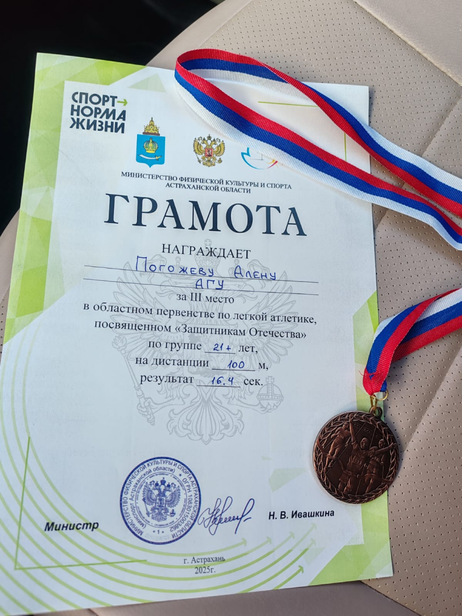 Преподаватель факультета физики, математики и инженерных технологий Астраханского государственного университета имени В. Н. Татищева Алёна Погожева приняла участие в областных соревнованиях по лёгкой атлетике, посвящённых защитникам Отечества.