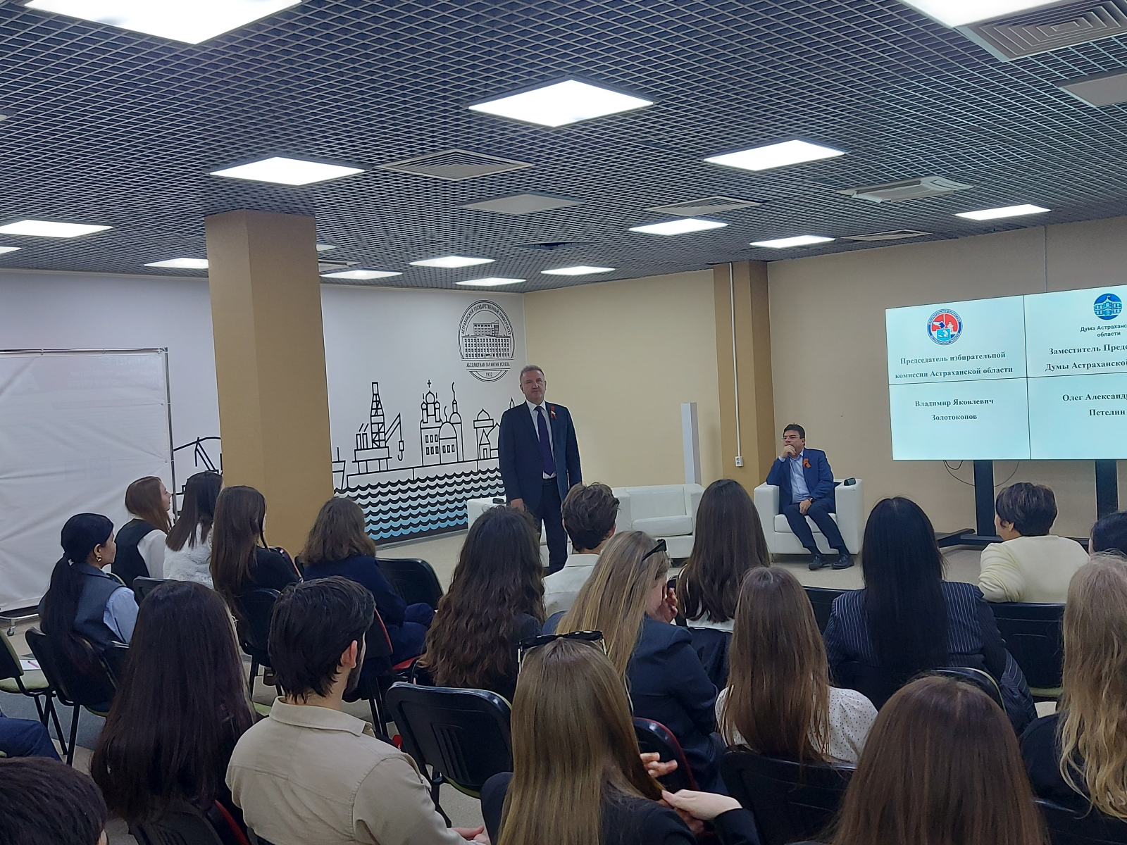 В рамках проекта «Школа молодого политика» на базе центра избирательного права и процесса Астраханского государственного университета имени В. Н. Татищева состоялась встреча студентов с председателем региональной избирательной комиссии Владимиром Золотокоповым и заместителем председателя Думы Астраханской области Олегом Петелиным. В мероприятии также приняли участие обучающиеся астраханских филиалов Международного юридического института и Саратовской государственной юридической академии.