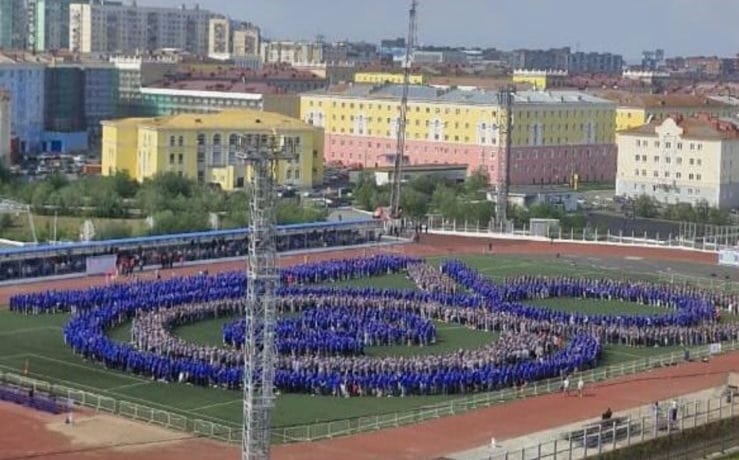 Более 3,5 тысяч человек собрались на местном футбольном поле, чтобы выстроиться в гигантскую надпись «Норникелю 90 лет». На газоне были заранее размещены таблички с названиями подразделений, а каждому участнику отводилось строго определённое место.