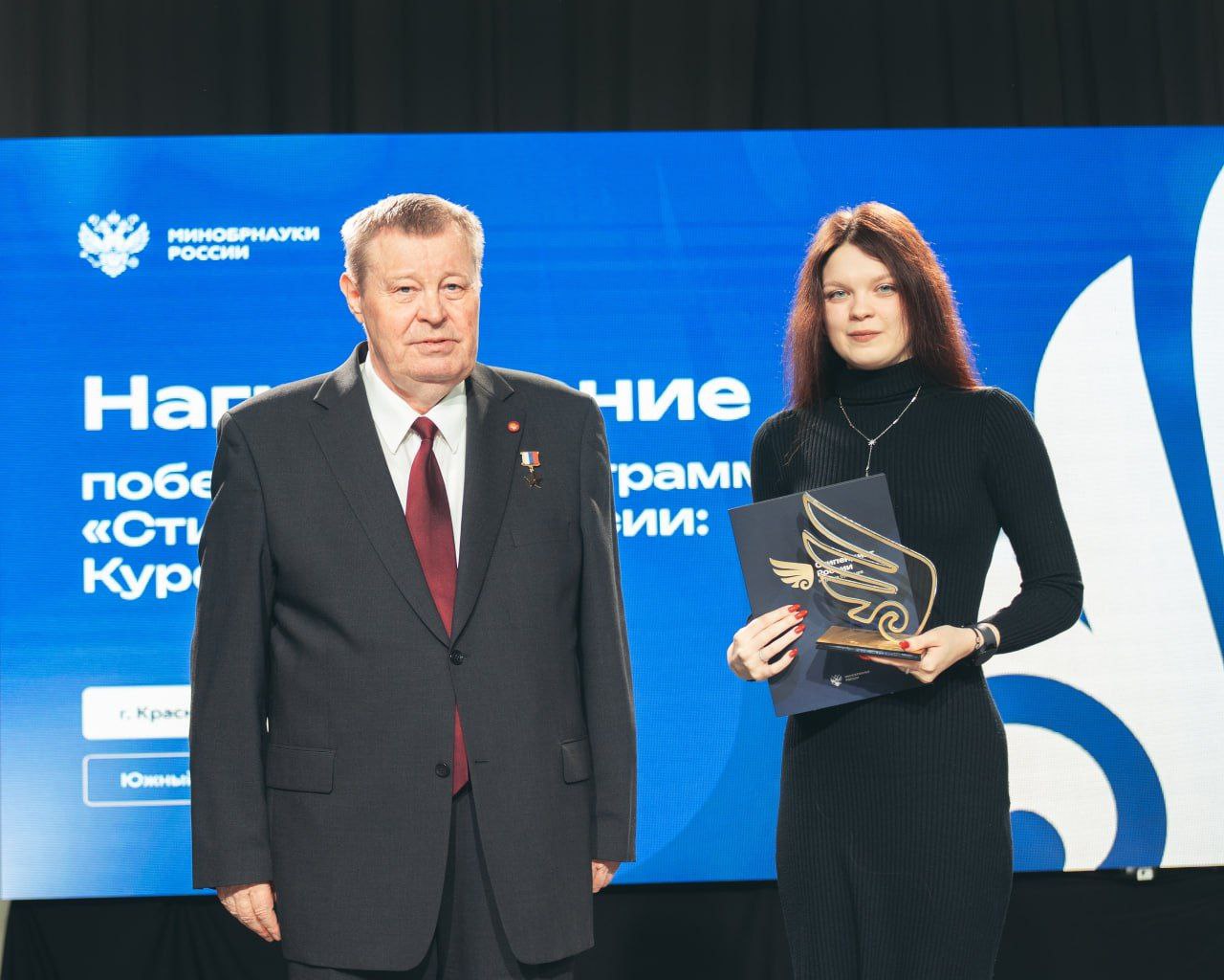 Кроме того, студентка получила стипендию Президента Российской Федерации. Церемония вручения прошла в Краснодаре, где награду лично вручил полномочный представитель Президента РФ в Южном федеральном округе Владимир Устинов. Студентка также стала стипендиатом имени президента Академии наук СССР академика А. П. Александрова и победила в конкурсе «Умная стипендия», успешно защитив свой проект.
