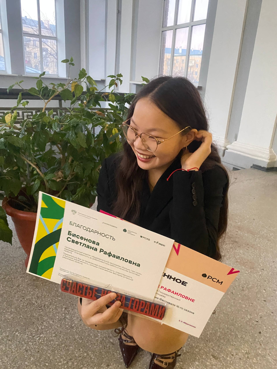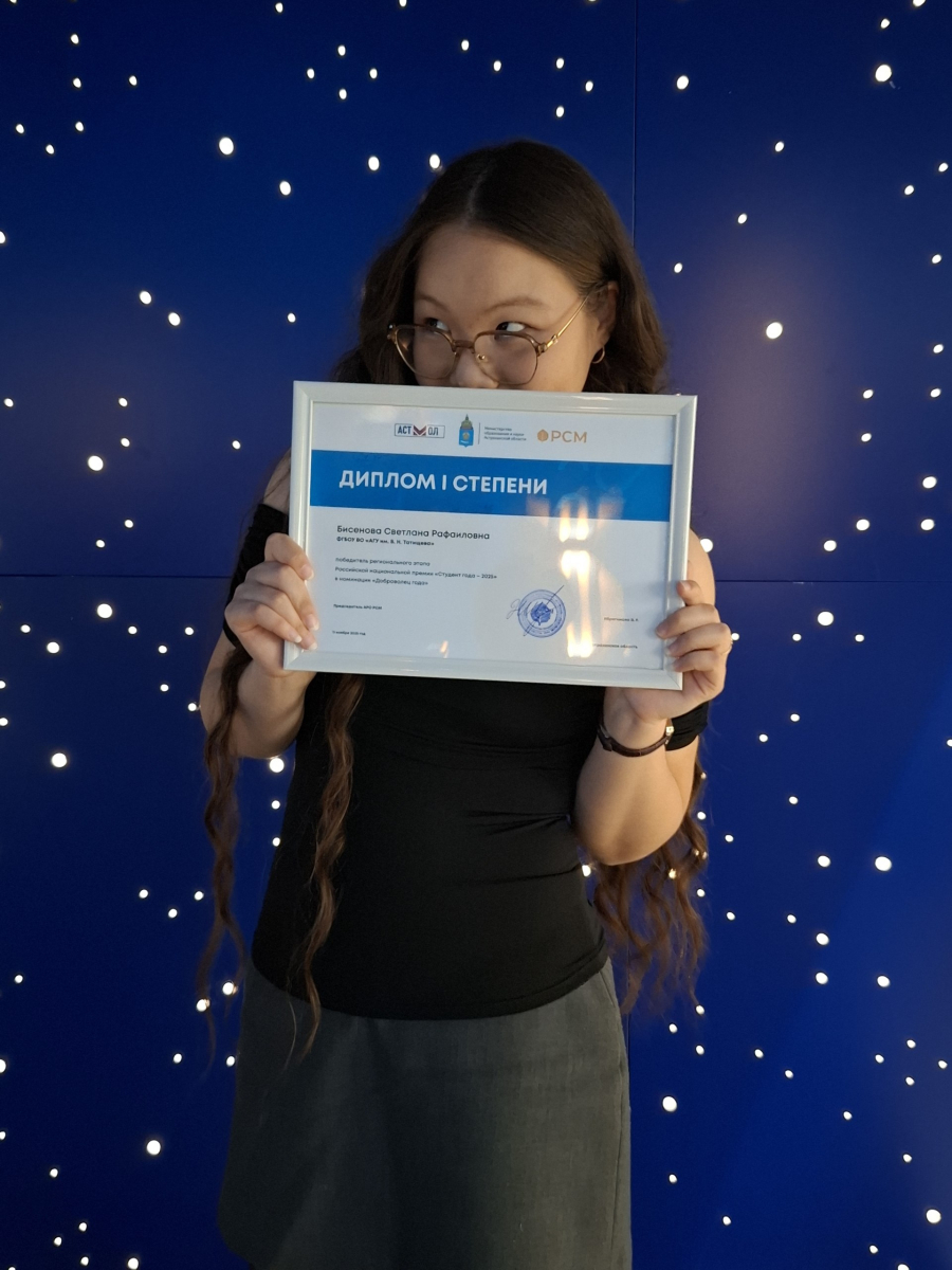 «2025 год принёс мне множество достижений: я стала старостой, членом Российского союза молодежи, завоевала титулы «Студент года» и «Доброволец года», а также получила право на губернаторскую стипендию. И это лишь самые крупные мои победы», — говорит Светлана Бисенова.