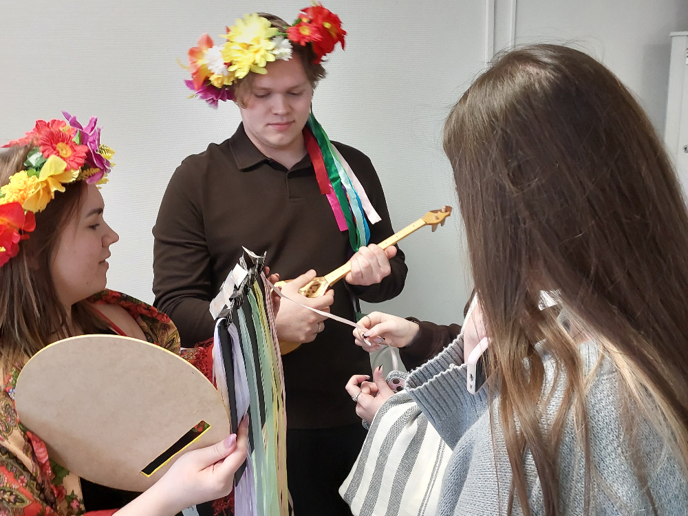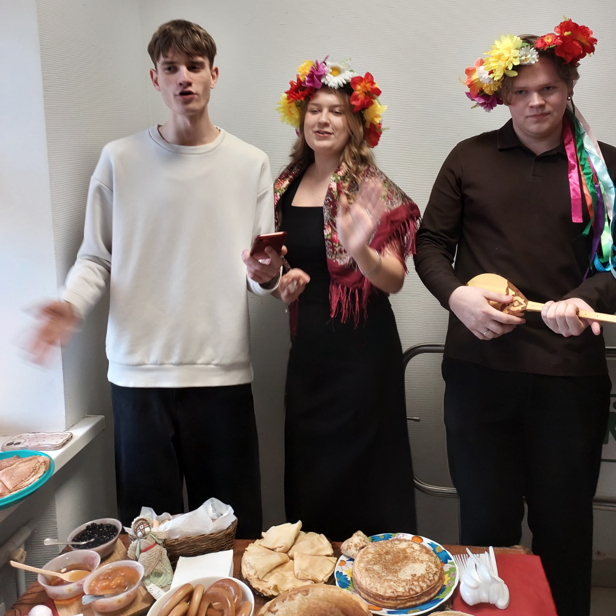 Не обошлось без весёлых песен и народных напевов — студенты пели хором, вспоминая традиции. Всех желающих угощали блинами: с мёдом, сметаной, вареньем. Атмосфера была тёплой и душевной.