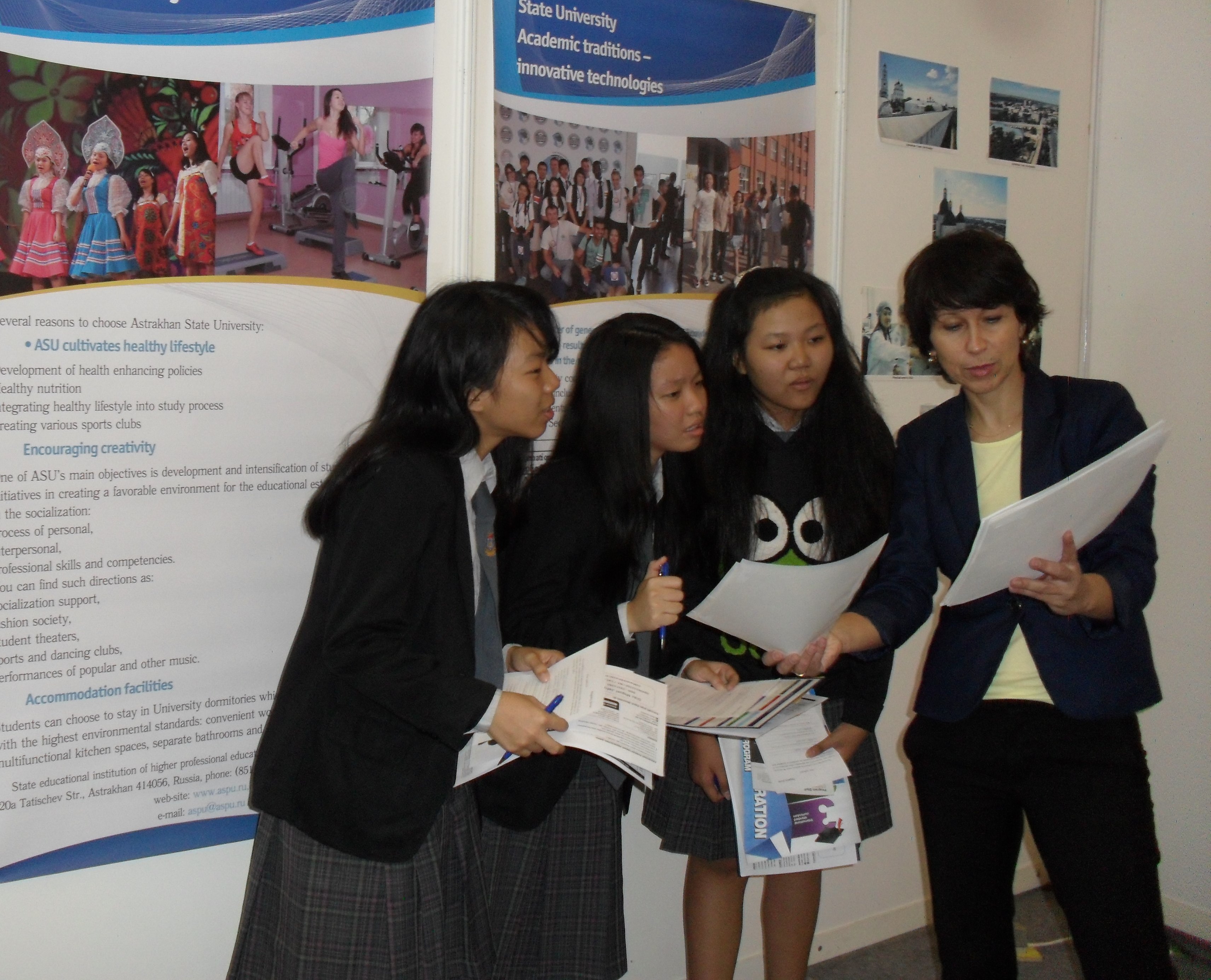 Первые 2 дня выставку посещали, в основном, школьники. Их интересовало, холодно ли в России, насколько гостеприимны астраханцы, легко ли получить визу, трудно ли выучить русский язык. Мы с удовольствием отвечали на все вопросы, старались как можно подробнее изложить всю необходимую информацию. В выходные пришлось поработать более интенсивно. Ребята приходили вместе с родителями, и вопросы были серьёзнее: они касались цен на обучение, возможности получения стипендий, условий проживания в общежитии, выбора программы. Благодаря информативным буклетам и плакатам, «домашним заготовкам», нам удавалось рассказать обо всём, что интересовало посетителей, в полном объёме. Пользуясь широким выбором программ бакалавриата и магистратуры, реализующихся в АГУ, мы смогли помочь всем сделать оптимальный выбор будущего направления подготовки. Гости с удовольствием оставляли нам свои координаты для дальнейшего общения.