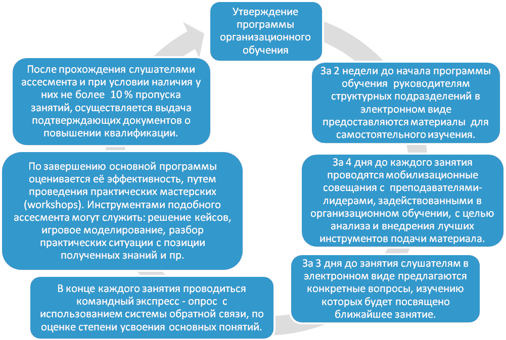 Весь сентябрь организационное обучение было посвящено изучению книги Джилл и Дэвида Шарфф «Основы теории объектных отношений». Руководители структурных подразделений знакомились с категориально-понятийным аппаратом, сущностью и спецификой данной теории. Сам процесс проведения организационного обучения был стандартизирован и осуществлялся по следующей схеме: