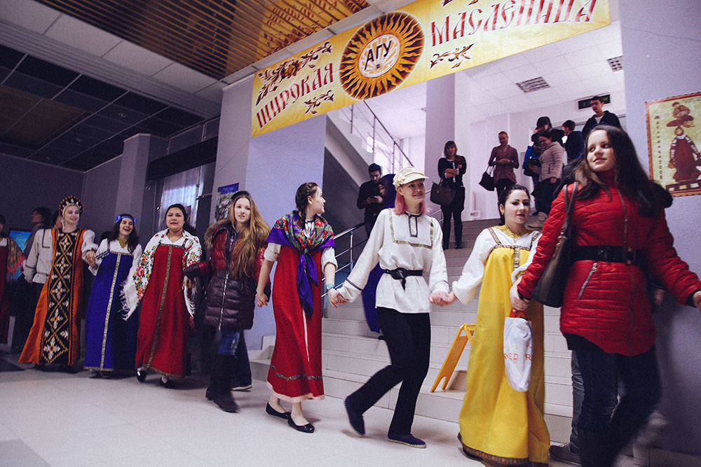 Традиции проводить масленичные гуляния в АГУ 11 лет. Организаторами этого мероприятия неизменно выступают преподаватели кафедры культурологии ФСК. В число волонтеров входят студенты со всех факультетов университета.