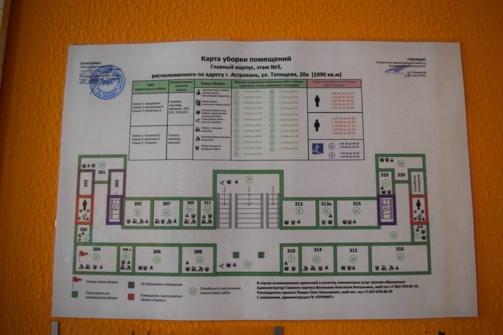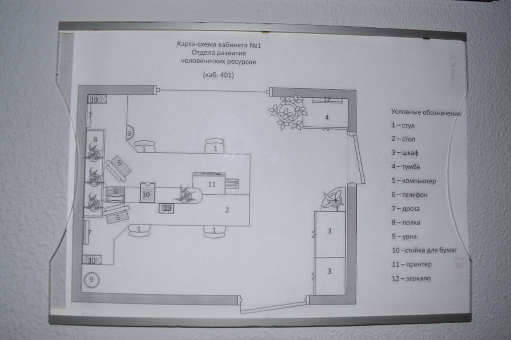 В каждом кабинете расположена карта-схема. Её основное назначение – обеспечение визуального стандарта поддержания порядка в офисе и предупреждение возникновения или своевременное обнаружение проблемных ситуаций. На такой карте-схеме отображены все материальные объекты офиса, обозначены места их расположения. Благодаря этому любой проверяющий может осуществить визуальный контроль наличия всего оборудования, мебели, их расположения.