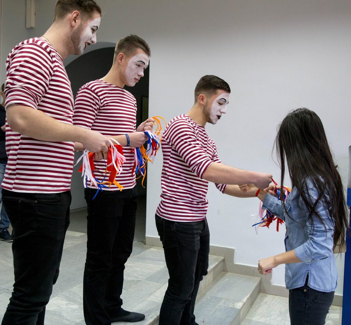 Первый акт. Таких ярких занятий студенты ещё не видели: волонтёры – будущие социально-культурные деятели и социальные педагоги – в образе мимов встречали гостей, повязывали ленты различных цветов (которые символизируют различные проблемы современного общества) на запястье и провожали к столам регистрации. И всё это без единого слова!