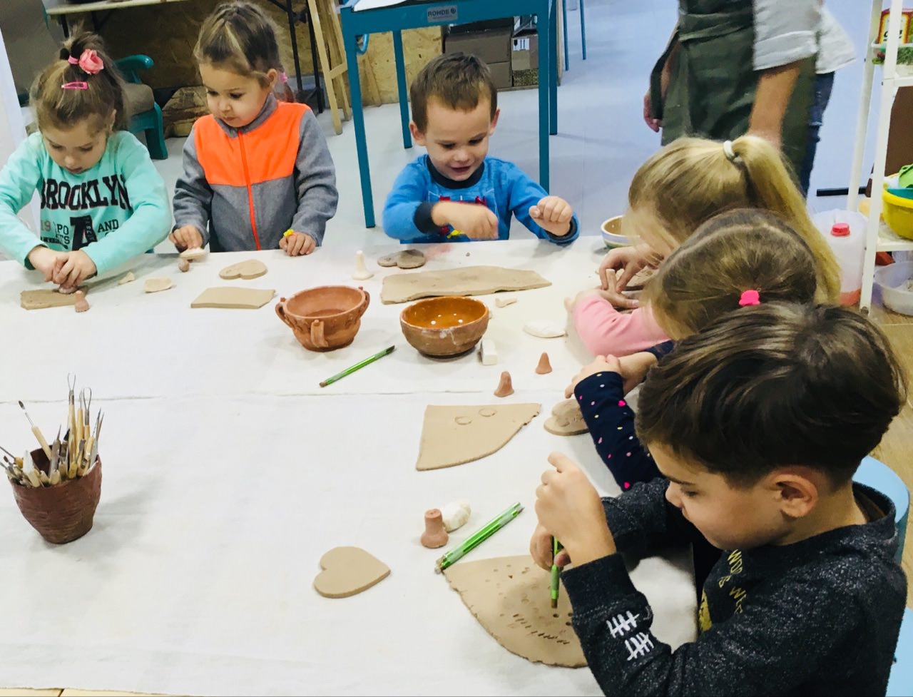 Творческий процесс в детской аудитории развивается молниеносно. Достаточно ребёнку заполучить кусочек глины — и он сразу оживает в его руках, а если есть в наличии диковинные штучки под названием стеки (инструменты керамиста), то работа кипит, главное — не отвлекайте.