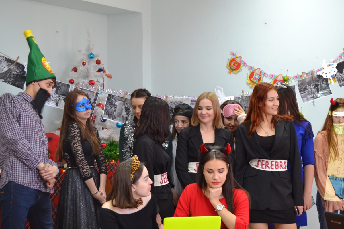 Поздравить младших товарищей приходили и студенты 2 и 3 курсов. Одним из заданий для обучающихся было придумать образы для новогоднего бала-карнавала, поэтому вместо знакомых лиц студенты смогли увидеть солисток группы Serebro, кошек, Спящую Красавицу, фей и даже... Шампанское.
