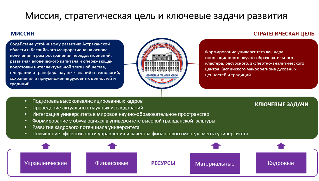 В соответствии с этим миссия Астраханского госуниверситета сформулирована следующим образом: содействие устойчивому развитию Астраханской области и Каспийского макрорегиона на основе получения и распространения передовых знаний, развития человеческого капитала и опережающей подготовки интеллектуальной элиты общества, генерации и трансфера научных знаний и технологий, сохранения и приумножения духовных ценностей и традиций.