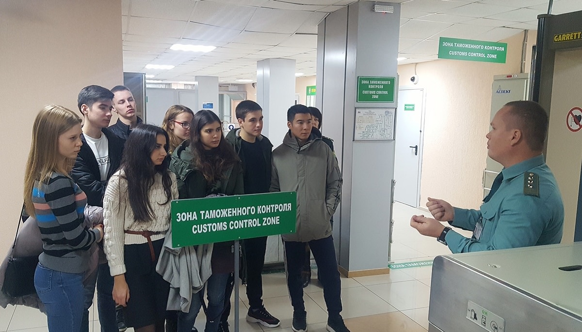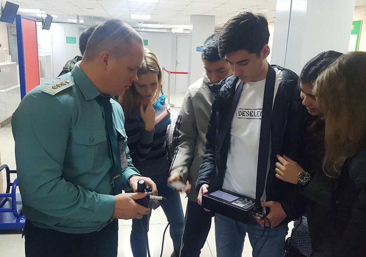 Экскурсия на таможенном посту «Аэропорт Астрахань» началась с зала вылета, где студенты смогли увидеть систему двойного коридора (зелёный/красный) и узнать о работе системы «Янтарь», установленной для предотвращения незаконного перемещения радиоактивных веществ.