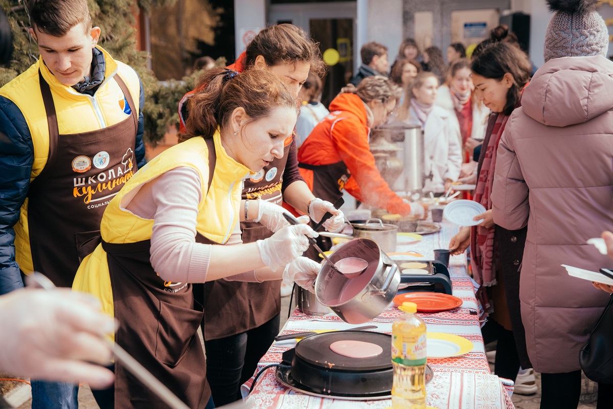 Помимо этого на территории главного корпуса АГУ состоялся мастер-класс по выпечке необычных разноцветных блинов, организованный учебным центром ресторанного сервиса и гостеприимства.