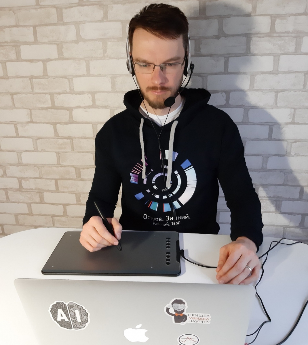 «Для этого я оборудовал домашнюю студию самозаписи. Взял видеокамеру и микрофон для неё, штатив, стул, петличку, графический планшет, хорошее настроение, энтузиазм и начал снимать, — делится преподаватель. — Кстати, графический планшет я приобрёл за день до ухода на дистанционную работу как раз для подготовки интерактивных лекций и комментирования самостоятельных работ. С ним можно быстро, удобно и наглядно делать пометки в презентациях и файлах».