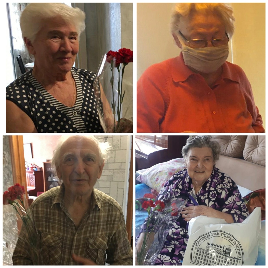 Активисты передали слова поздравлений и денежные выплаты к праздничной дате от руководства университета, вручили цветы и традиционные продуктовые наборы ко Дню Победы от профсоюза.