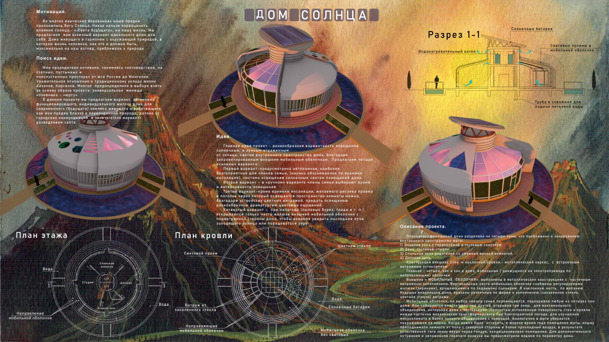 «Мои прародители кочевали, занимаясь скотоводством, на великих степных, пустынных и полупустынных просторах от юга России до Монголии. Уважительное отношение к традиционному укладу жизни казахов, киргизов, монголов подтолкнуло взять за основу образа проекта универсальное жилище кочевника — юрту. Мы предлагаем вариант автономно функционирующего индивидуального жилого дома для современного человека, живущего и работающего вдалеке от городских коммуникаций», — рассказывает автор инициативы, доцент кафедры архитектуры АГУ Валерий Сидоров.