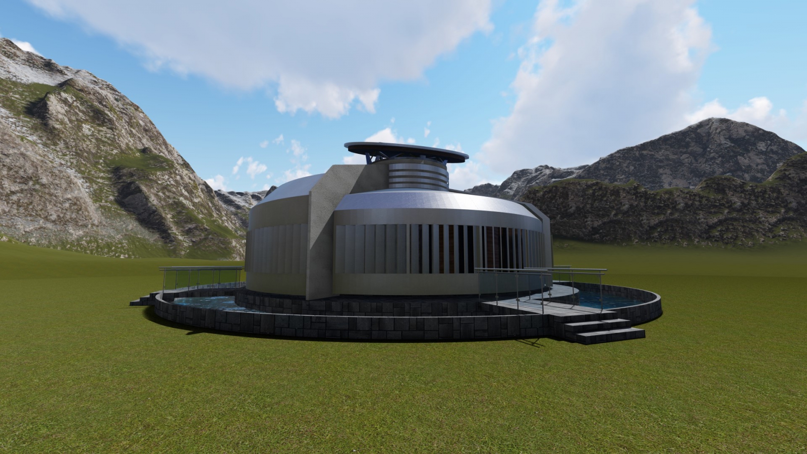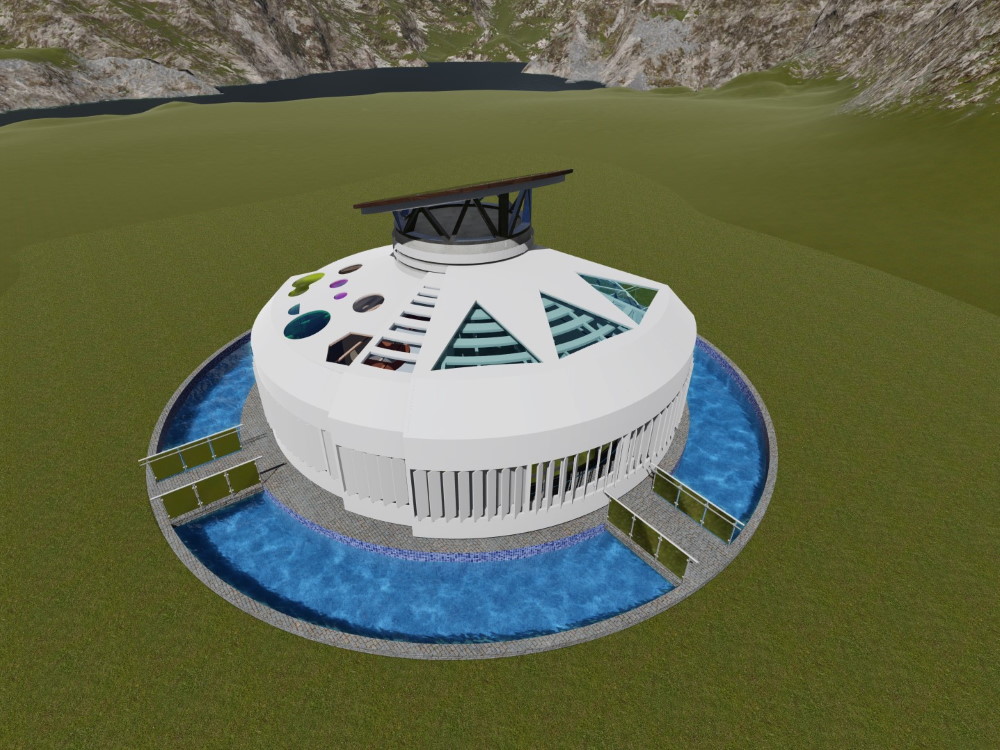 Для дополнительного охлаждения и увлажнения горячего воздуха предусмотрен водоём по периметру строения. Таким образом, система естественного освещения в доме способствует благоприятной обстановке, защищает помещение от перегрева, помогает экономить электроэнергию в дневное время.